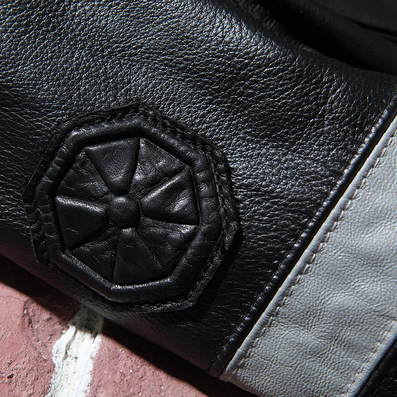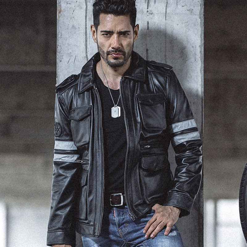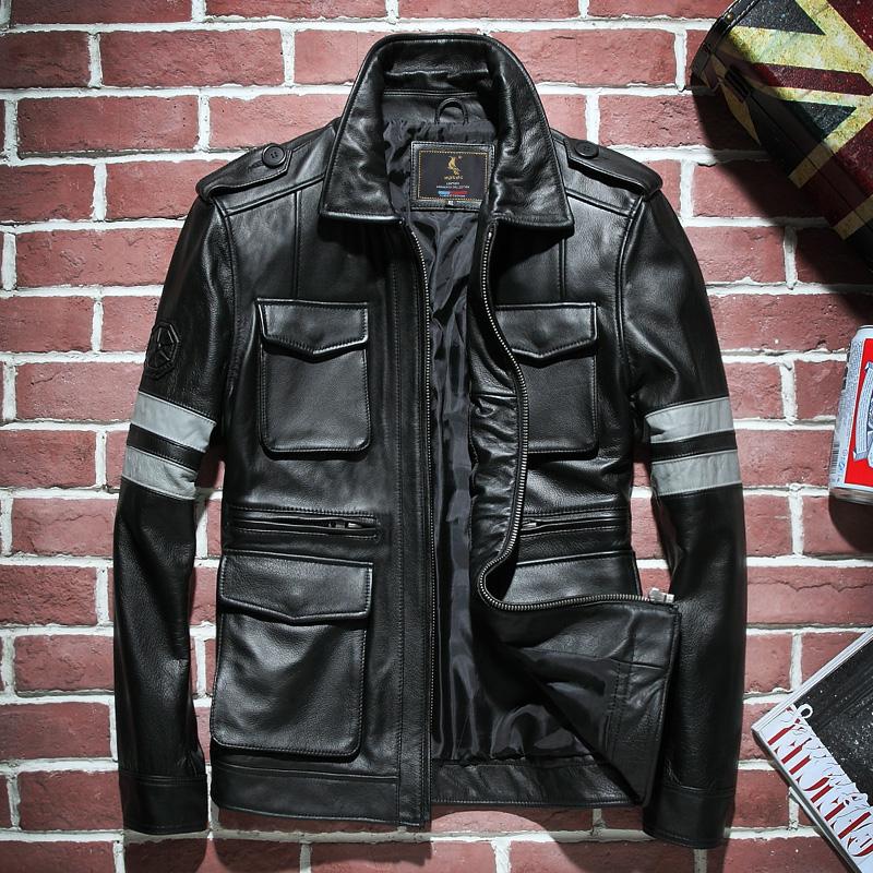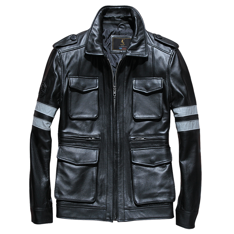 修身皮衣的撞色横条纹装饰衣袖设计,非常新潮。做工精细,好品质头层牛皮面料,质感好,透气性好,舒适与个性表现的十分到位,修身短款的腰身配上多口袋装饰,帅气有型,尽显别致的男人味儿。