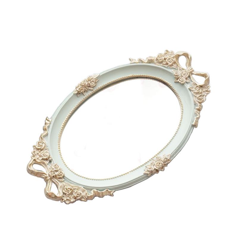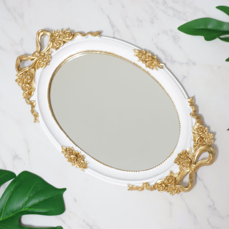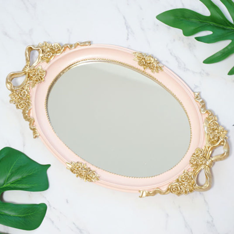 让托盘跳脱功能实用性的单一意境,用欧式宫廷风的修饰手法为其赋予高贵的气质,无论是那精致立体的雕花还是泛着哑光质感的金属色泽点缀,都完美诠释了美不胜收的真谛。典雅的椭圆形镜面托盘,更具有恰好反射空间的用途,置放物与其成像巧妙对应,别有一番耐看之韵。而甜美的蝴蝶结把手更是一大亮点,装饰颜值爆表,贴心地于底部融入了黑色绒面及脚垫,防滑静音亦无惧刮伤。