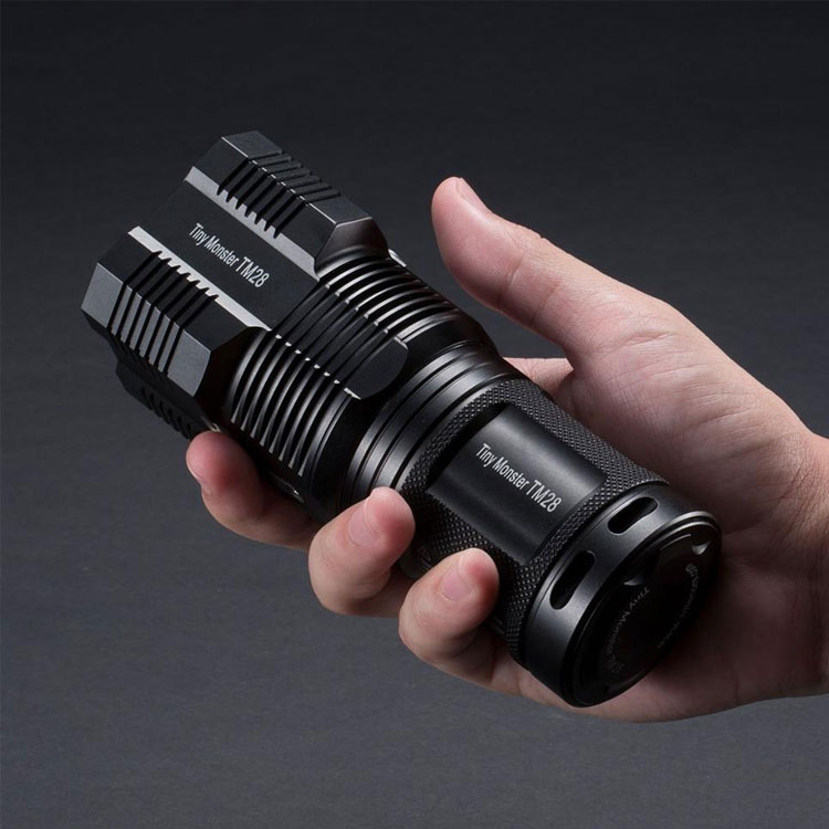 NITECORE TM28或许仅凭硬朗霸气的外观就能吸粉无数,由4颗CREE XHP35 HI LED组合成的方形灯头具有强悍的爆发力,最高可达6000流明的震撼亮度,可照亮655米高远距离。并且由航天级铝合金制作灯壳,通过划纹与磨砂表面处理后,手感舒适,不刮手。而且恰到好处的金属质量,握在手中也非常扎实。