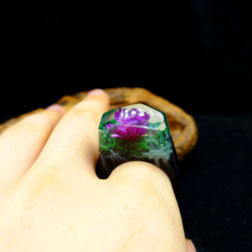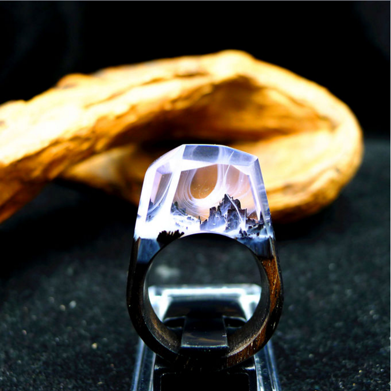 这款魔法森林微景观戒指,采用木材质和树脂结合制做而成。经手工抛光打磨制作,形状立体质感光滑,使佩戴贴合舒适。配以个性美观的图案,让人想起大圣归来中紫霞仙子说过的话,我的意中人是个盖世英雄,有一天他会踩着七色的云彩来娶我,充满意境感。