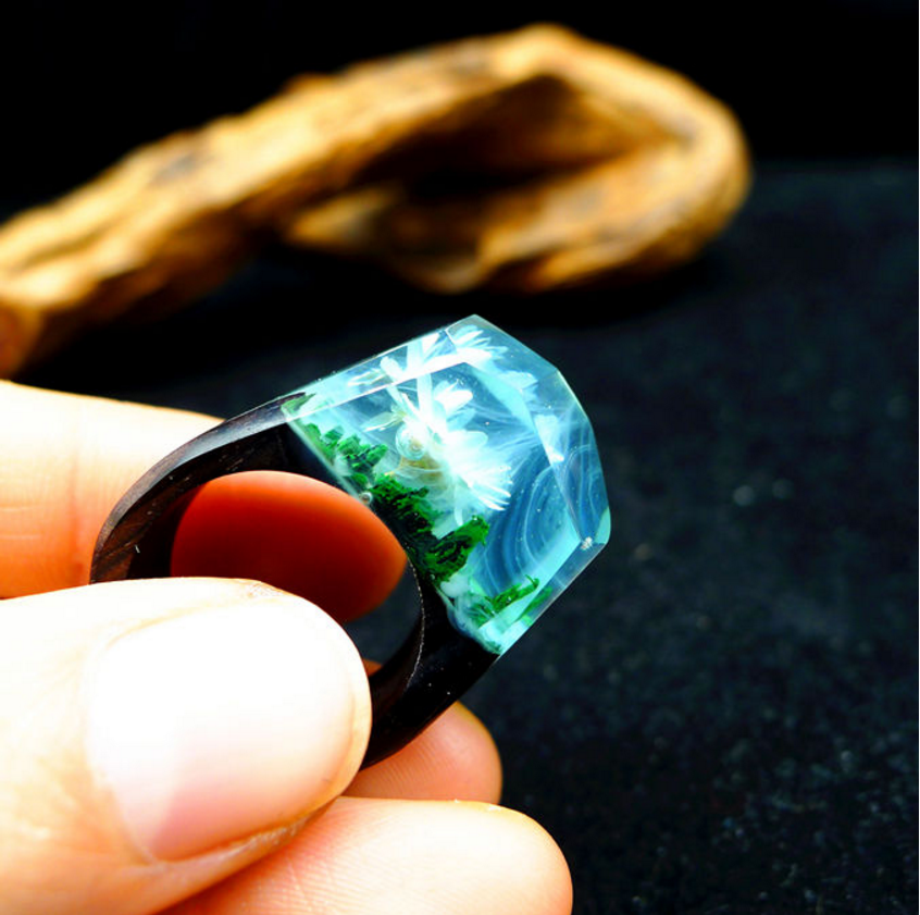 这是一款树脂与木戒指,不同于金属戒指,给人不同的感觉。利用木质断面和树脂的结合,实现景的塑造,因不同的木质所具备的肌理不同,所以不会有相同的一枚戒指,不可重复,仅此唯一。用心做的饰品是完全不同,匠心独运,手工打磨而成。