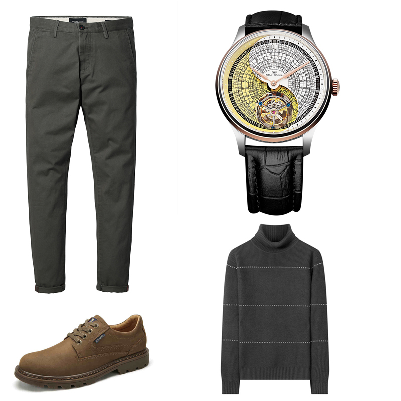 这块设计独特又赋有内涵的腕表,黑色的表带与金白搭配,充满着时尚休闲的韵味,为此很适合轻熟风的搭配,为此可在上身搭配一件高领细条纹的毛衣,和一条灰色的简单长裤,不仅干练利落,并凸显气质端庄的男神魅力,而在脚下可搭配一双土黄色低帮鞋,不失时尚复古气息。