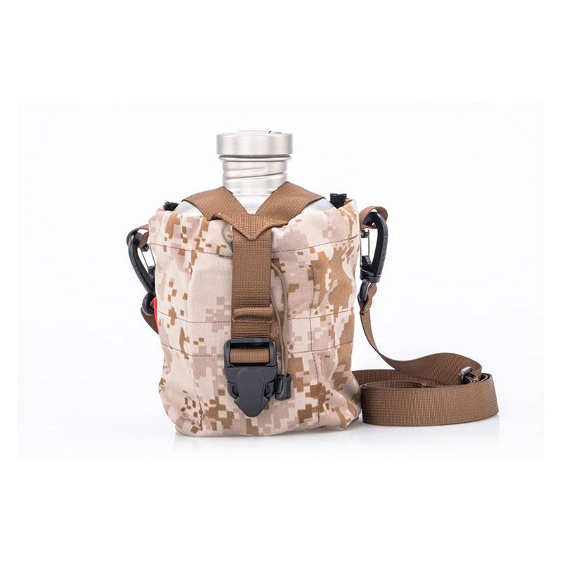 水壶的整体结构统一,在表层添加喷砂工艺,细腻的磨纹,握持在手中时质感突出。并且弧形倒角打磨,符合手掌的结构,细心贴合,不具挂磨感。针对水壶还置有一件配护套,以军旅风的迷彩纹设计。合适的大小稳定将水壶装载其中,解放双手。