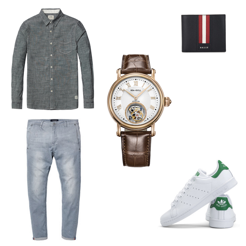 醒目的陀飞轮设计,加上华丽的色调,令腕间充满魅力,举手投足之间都展露不凡。在搭配上,可以选择一件深灰色的衬衫,休闲自在的都市风格随之展现。加上一条浅色的牛仔裤在下身,显得简洁大方,充满清爽效果。脚下以一双小白鞋来垫底,清爽自在,不会过分抢眼,却不失成熟与优雅绅士的格调。