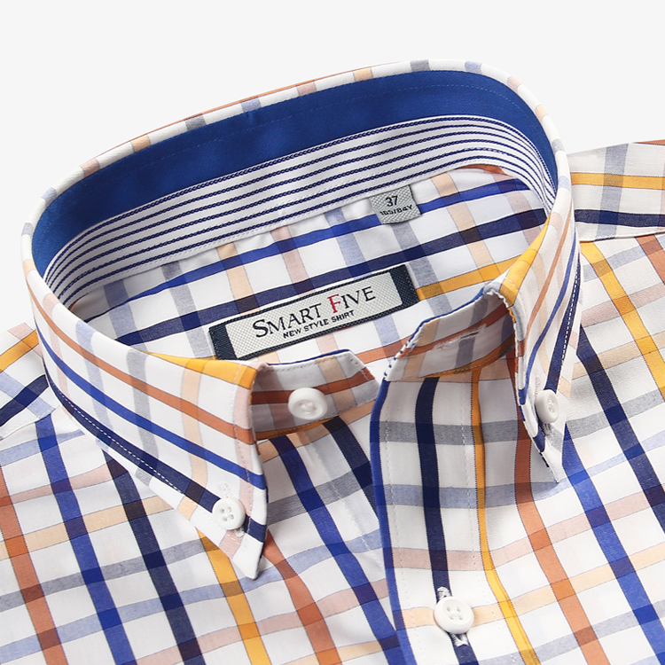 衬衫以其简单精干的特点,受到男士们的喜爱。SmartFive这款衬衫,在翻领内加入科德宝衬布,使其挺括不易变形。撞色格纹图案设计,打破传统格子衬衫的单调,显得更加新颖独特。并且有多个不同撞色可选,满足你的不同爱好与需求。弧形袖口呈现自然弧度,清爽利落。选用伟星纽扣,经久耐磨且健康环保,彰显细节品质。