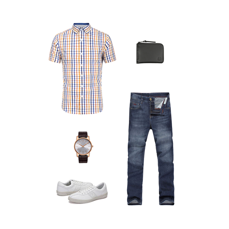 衬衫是商务人士大爱的一款日常穿着单品,格纹衬衫也是常见款式。搭配一条深色牛仔裤,打造休闲商务风格。脚蹬小白鞋,打破皮鞋的呆板感觉,显得更时尚。棕色手表佩戴腕上,方便读时,同时提升你的细节品味。短款钱包,小巧实用,简单出街的不错选择。