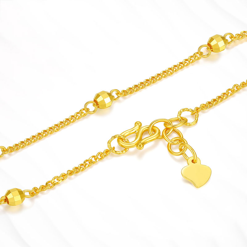 手链主要使用足金的材质制作而成,其光泽度比较高,是其它比较差的材质所无法比拟的,戴在手上的质感比较细嫩柔滑。它的表面带有一层自然的腊感,可以保证自身的光泽度,具有自然的粒纹和光泽,能够带来舒适的手感。