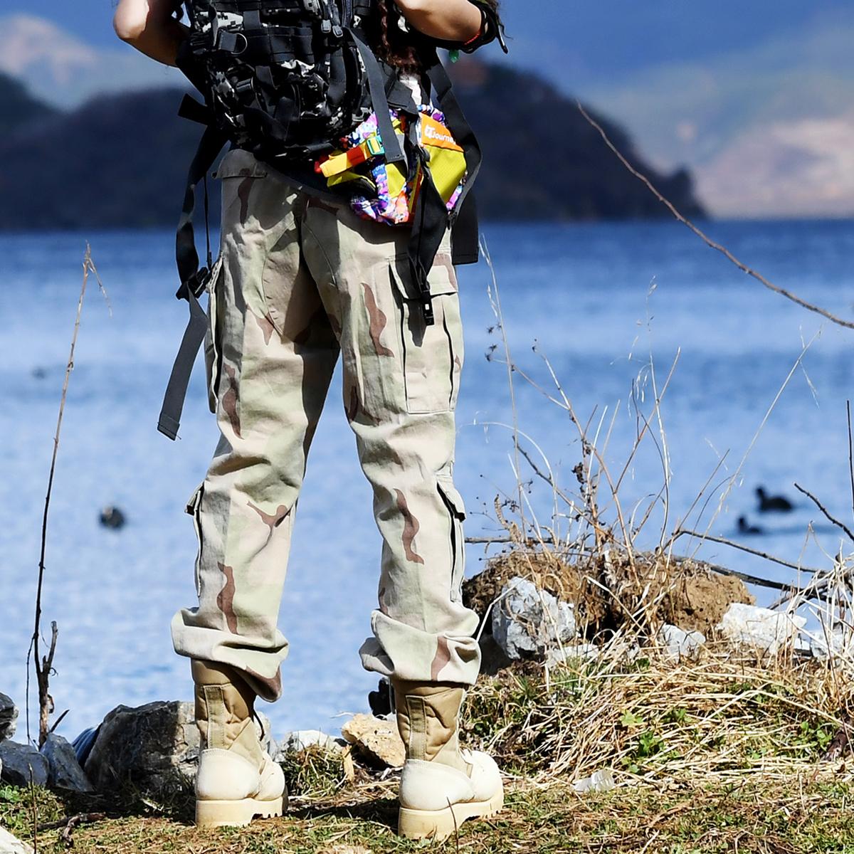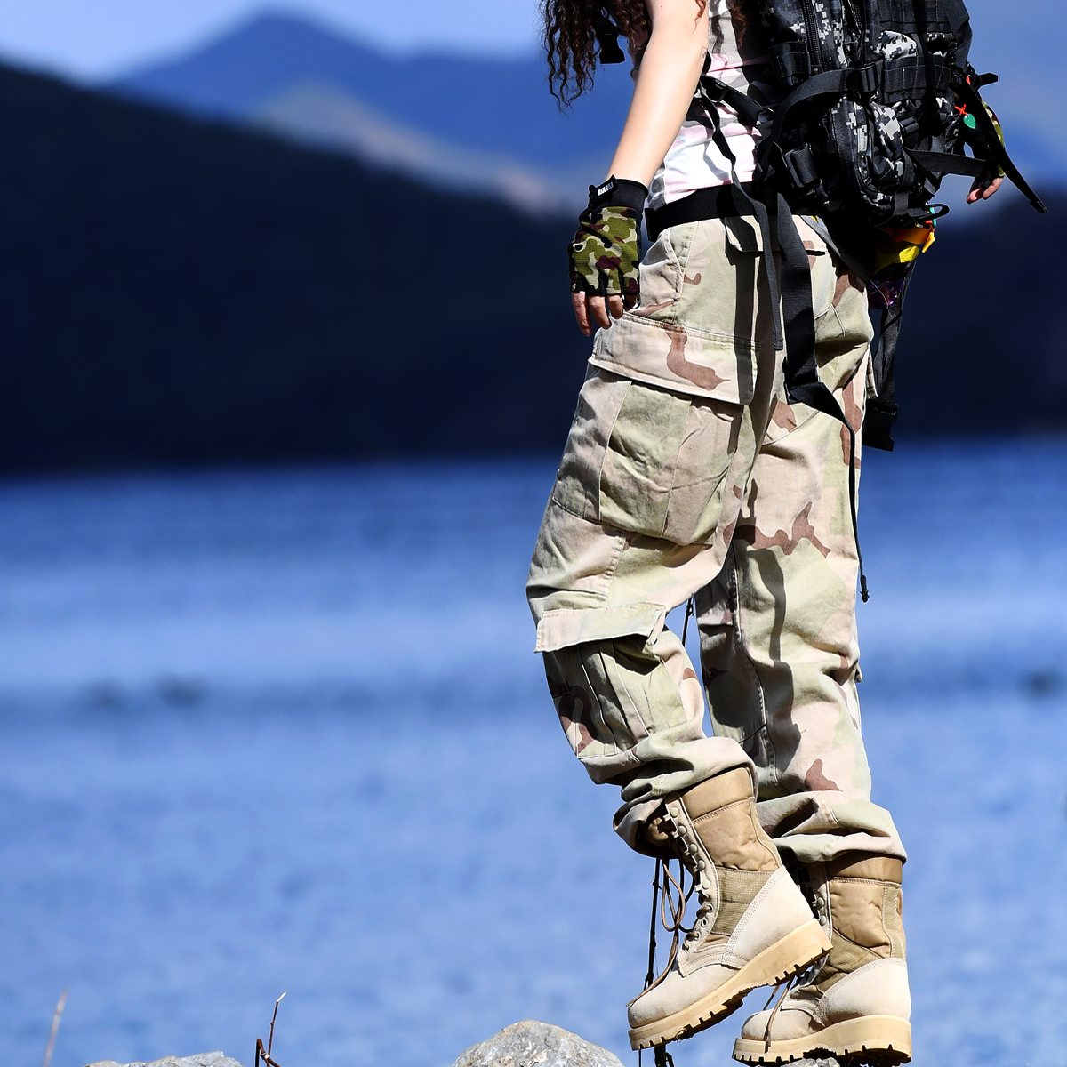 宽宽大大的迷彩工装裤,颜色属于比较经典的迷彩色,男女都可以穿,走路带有粗犷的工装风。面料经过水洗处理,手感比较轻柔。厚度适中,春秋都可以穿,户外出行的早晚也可以穿。腰间抽绳设计方便调节。束脚口的风格,走路干练。