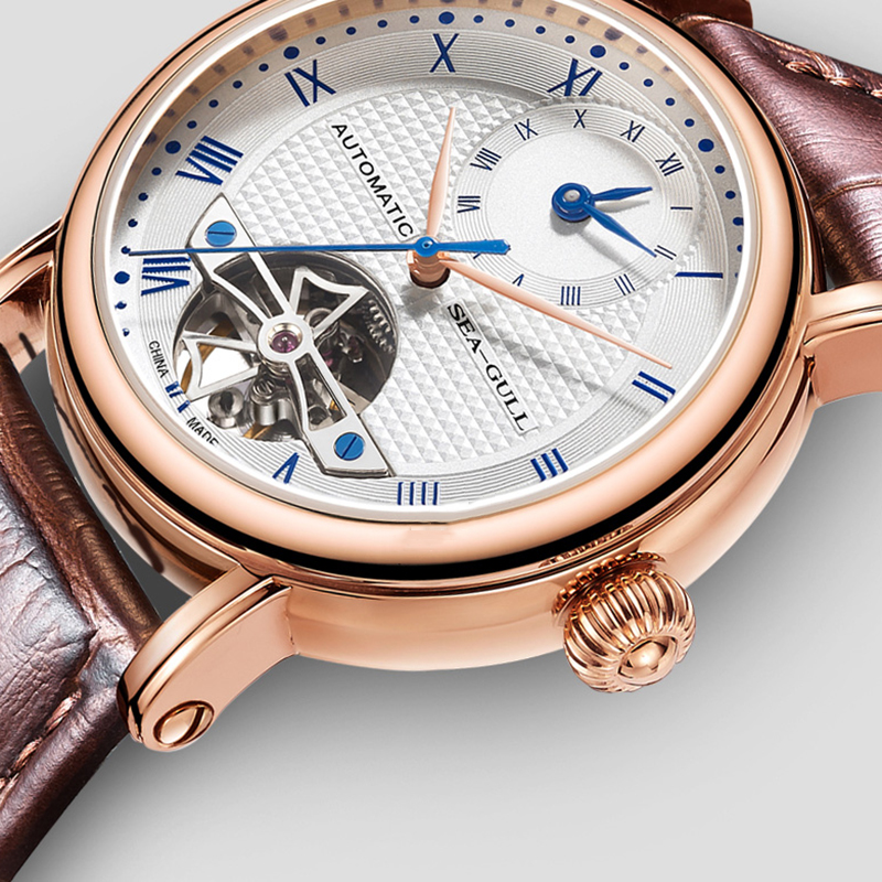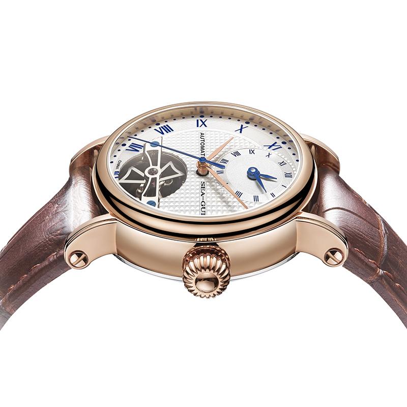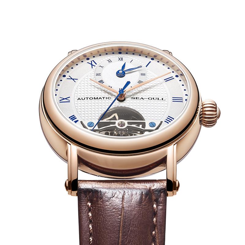 这款帅气双时区的自动机械手表,设计的亮点是在白色的表盘里设置镂空飞轮装饰设计。这种设计展现了男人的大气之美,白色表盘清新大方,带在手上更添腕间质感。