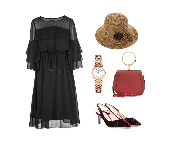 一款精致的腕表不仅仅可以看时间,还可以彰显一个人的身份和品味。一袭黑色连衣裙低调内敛,红色手提包提亮视觉,脚下的波点尖头鞋时尚复古,呈现出女性独特的魅力,最后戴上腕表,在细节处彰显气质,做个浪漫优雅的女子。