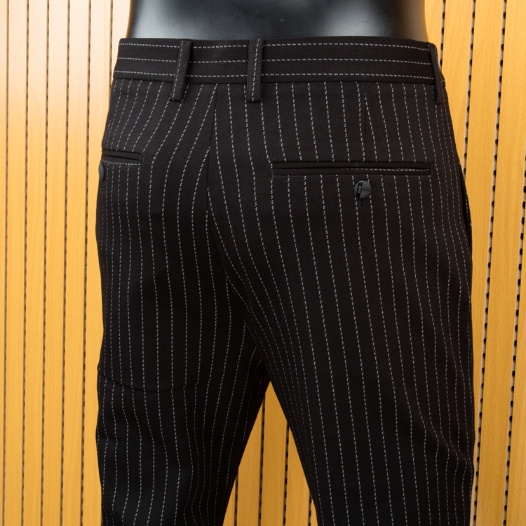 立体剪裁的版型,上身利落又有型,臀部设计更贴合人体曲线,小直筒的设计,修饰腿型。在搭配上,条纹面料搭配衬衫,商务范十足,搭配纯白T恤又具休闲范。