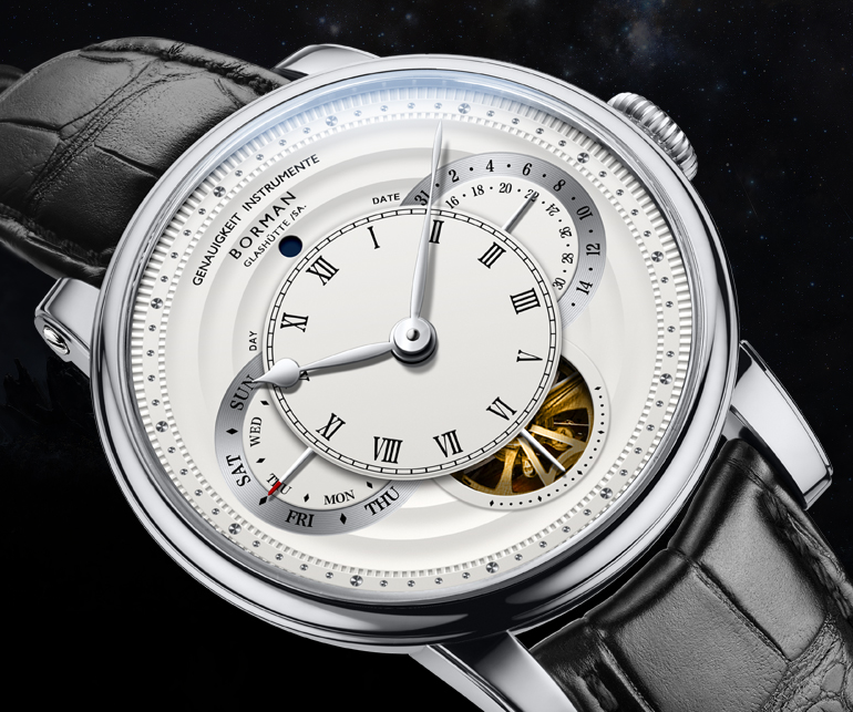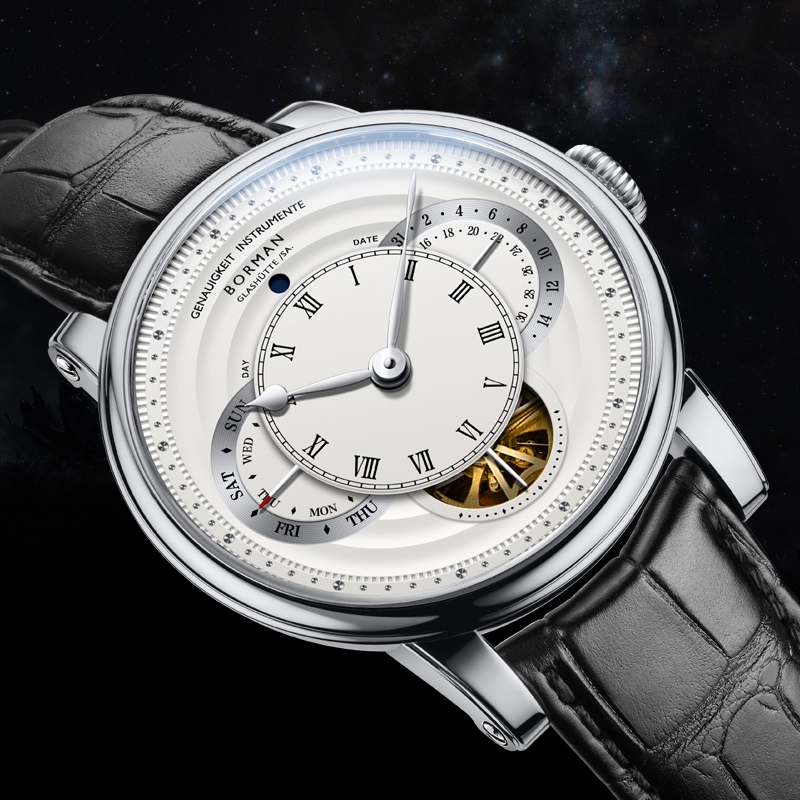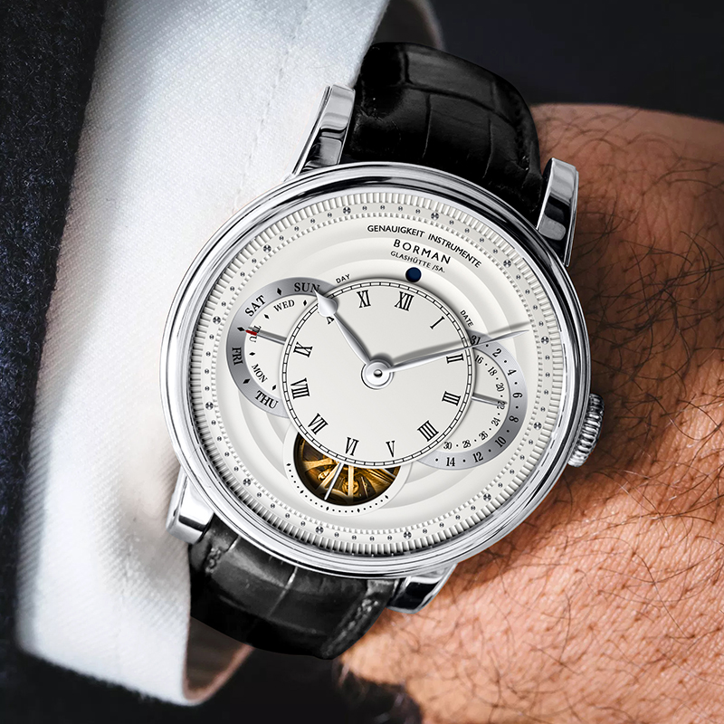设计感非常足的手表,与众不同的表盘设计,充满了美学工艺,累屋重架设计,演绎出建筑层叠美学,十二点钟方向的小孔呈现日夜指示,白天白色,出现夜空靛蓝色代表夜间,内圈罗马式时标搭配表盘外圈圆点条纹刻度,读数更加清晰。