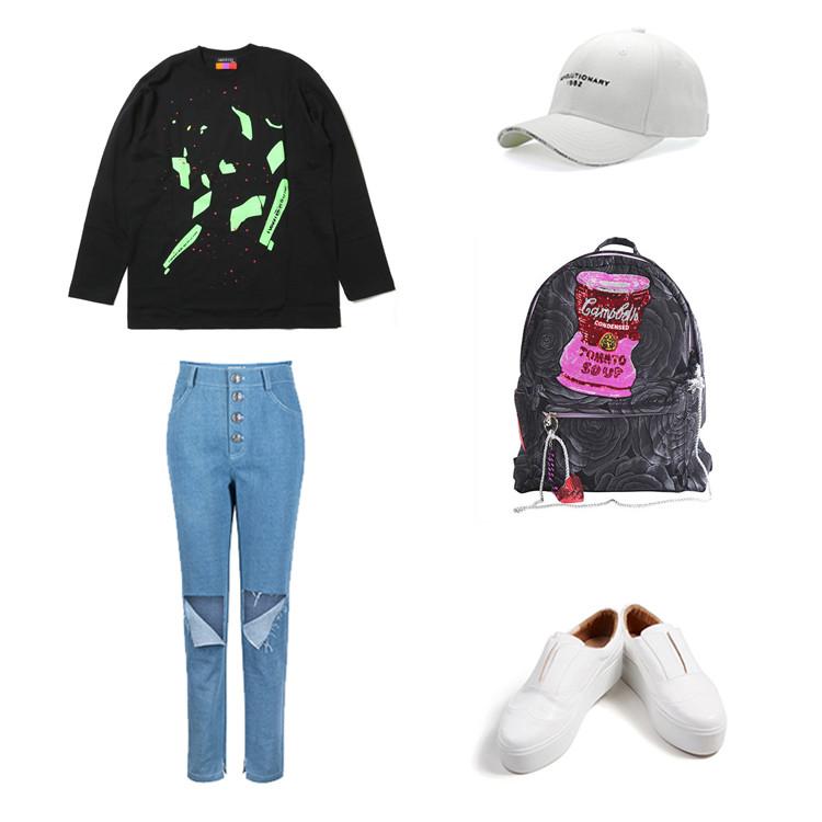 个性吸睛的撞色T恤,轻松打造时尚感强的休闲范儿。下面穿一条破洞牛仔裤,个性张扬,极具青春不羁感。搭一双平底板鞋,简约大气,上脚稳妥又干练。再戴一顶白色棒球帽,修饰脸型,更显帅气范儿。