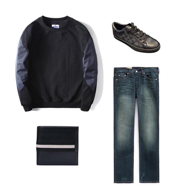 Levis的这款牛仔裤,通过直筒的修身裤型设计,运用五口袋装点与水洗蓝工艺处理,呈现随性复古的风格;从搭配上,上身选择一件黑色卫衣,配以撞色拼接于双臂点缀,打破纯色单一沉闷性,透露出玩味不羁的格调;出街再辅以一双老花板鞋及钱包加持,轻松打造帅气活力的潮男形象。