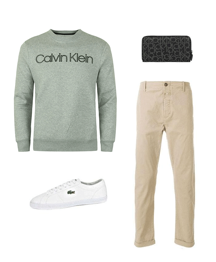 这款圆领卫衣,设计师以灰色进行渲染,再缀以字母装点,彰显出高街摩登腔调。在搭配方面,下身选择一条浅棕色长裤,翻折裤脚的设计,拉长腿部比例,流露出率性不羁的型格魅力;脚蹬白色平底鞋,鳄鱼图案的点缀,增添几分趣味性;辅以长款手拿包加持,轻松演绎出帅气有型的潮男模样。