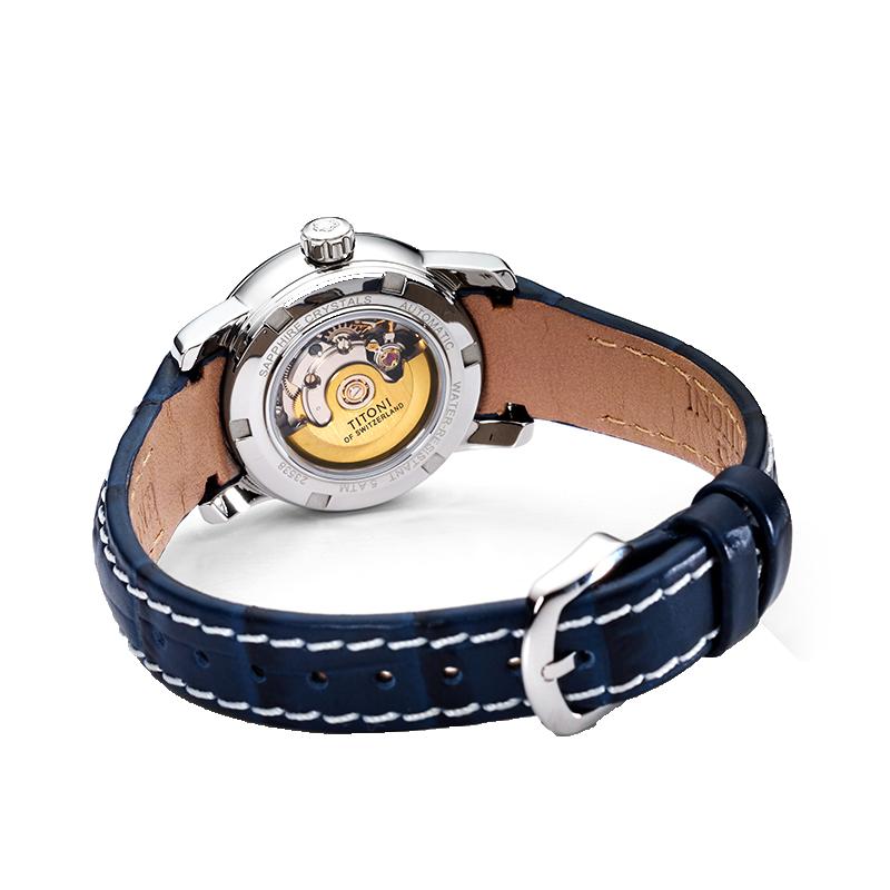 醒目蓝色色调,自带深邃与洋气感,诠释出女性高贵的风情。表盘上蓝宝石钻石的切割工艺,加上蓝色皮带,透露出不凡的风情。表搭载自动上链机芯,完美契合了本次的蓝色主题。细长实用的刻度让你更加轻松辨别,配上仿佛在进行一场宝石的游戏,精致华美,呈现出干练。