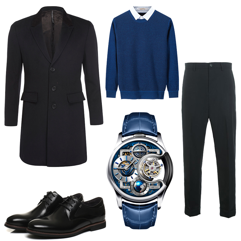 搭配这款钛银白的腕表可以选择一件假两件的针织衫进行内里的打底 ,结合一件毛呢的外套大衣进行上身的穿着,西裤的装饰,提升整体的商务穿搭风格,加以一双系带的皮鞋进行收尾,展现出时髦的商务气质。