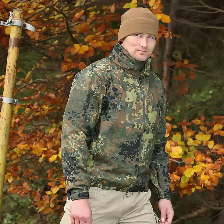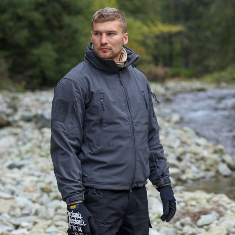 高衣领,可保证颈部保暖,面料经过杜邦特氟龙表面处理,抗污防泼水,特殊4向弹力化纤面料,多收纳空间,衣袖魔术贴,方便粘贴各种章标。