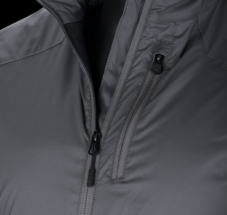 运用立体的裁剪拼接结构,打造出符合身体轮廓的版型,结合立领的设计,穿着帅气酷感。纯色的外观,视觉简洁大方。外层材质选用Schoeller's 3XDRY,具有排汗透气耐磨的特性。内层填充Polartec Alpha面料,穿着透气保暖。