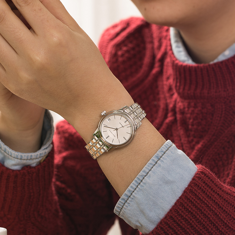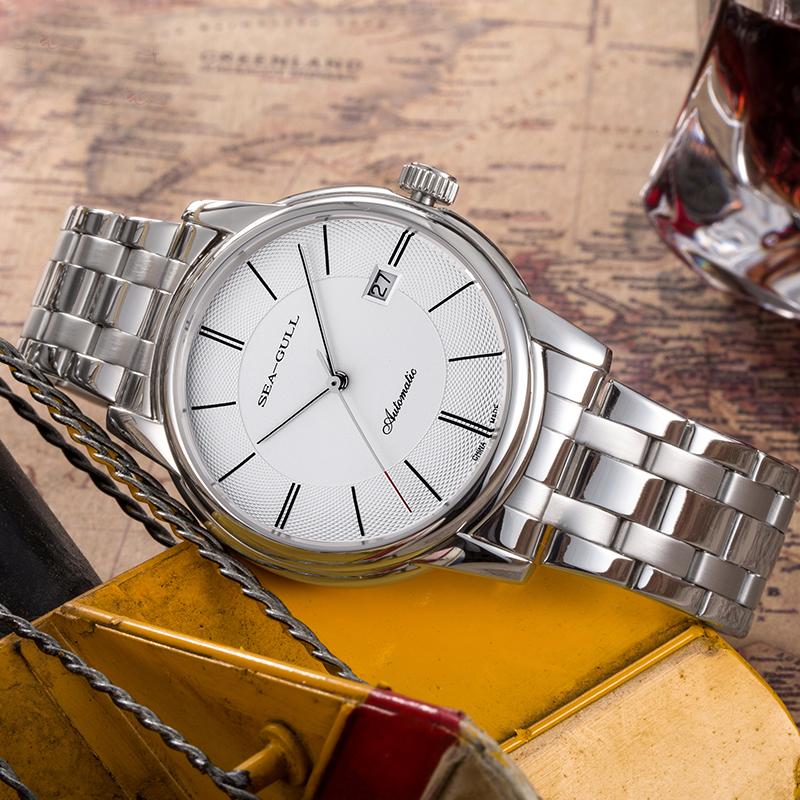 海鸥这款男士商务表整体设计简约大气,40毫米的表壳搭配金属感极强的钢带,品质感十足。经典的大三针设计搭配了日历功能,使得整个表盘简约大方,非常的时尚,加上棒形的时标镶嵌在白色的盘面,非常的立体。除此之外,手表还搭载着ST2130机芯,走时更加稳定。