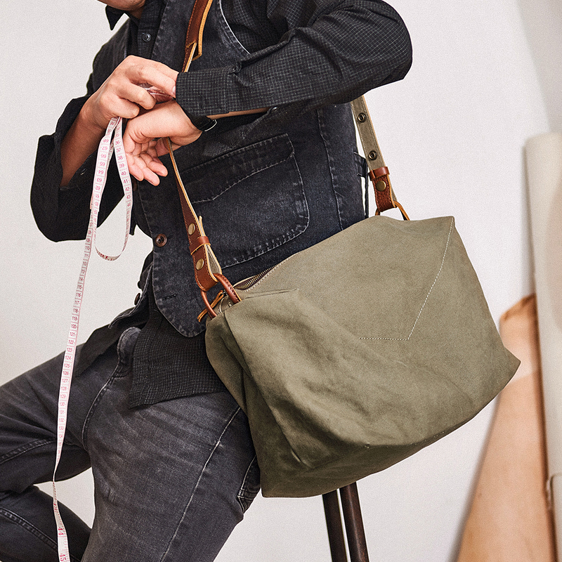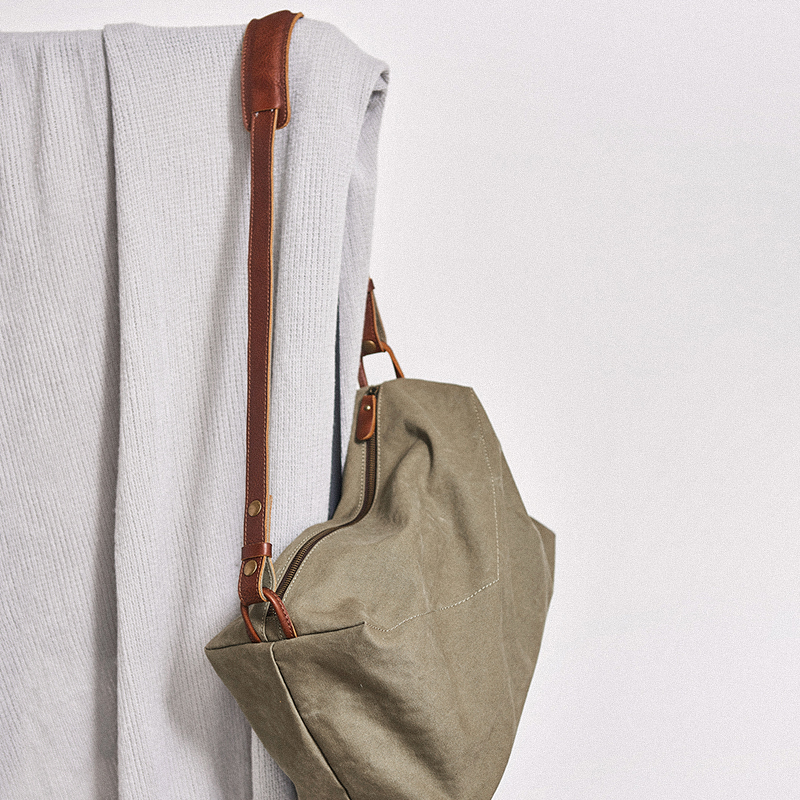 包包的搭配为整体的穿搭增添恰到好处的层次感,极致的展现专属于自身的风格。兼顾美观与实用性,以超大的包型轻松的收纳外出物品。不规则的包型设计给人慵懒文艺范儿十足的视觉效果。选用定制加厚的帆布面料,耐磨耐脏紧致密实,提升经久耐用度。以进口的头层牛皮散发着高级品质感,散发淡淡的自然柔和光泽感。