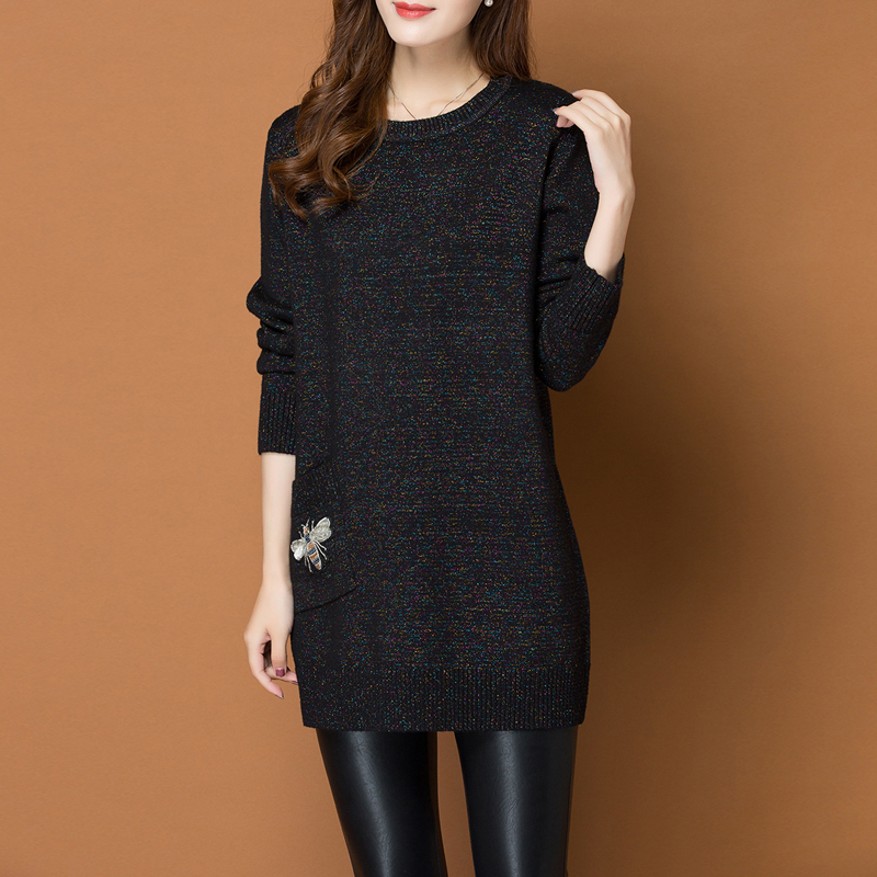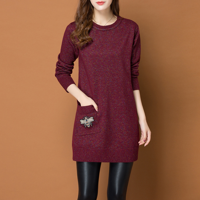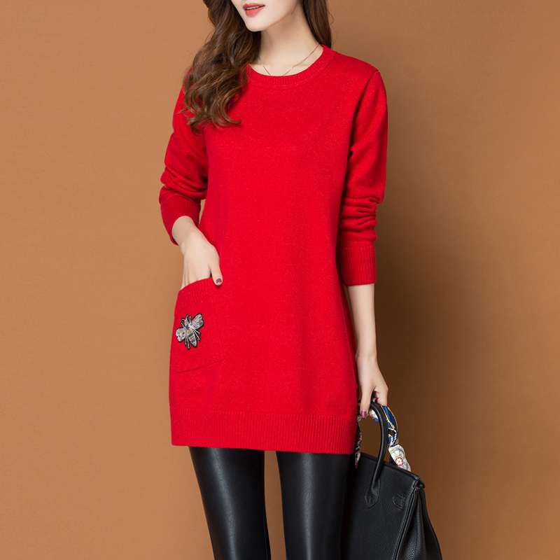中长款的针织毛衣,宽松挺括包容肉肉,塑造高挑身形。微收腰设计,提升身材比例,勾勒纤瘦身段。舒适小圆领,修饰颈部线条,衬托出一副瓜子脸庞。单边口袋设计,满足日常所需,上面刺绣小蜜蜂图案点缀,针脚细致富有立体感,栩栩如生,为衣服增添一些亮点,时髦不沉闷,平时作为打底或单穿都适宜。