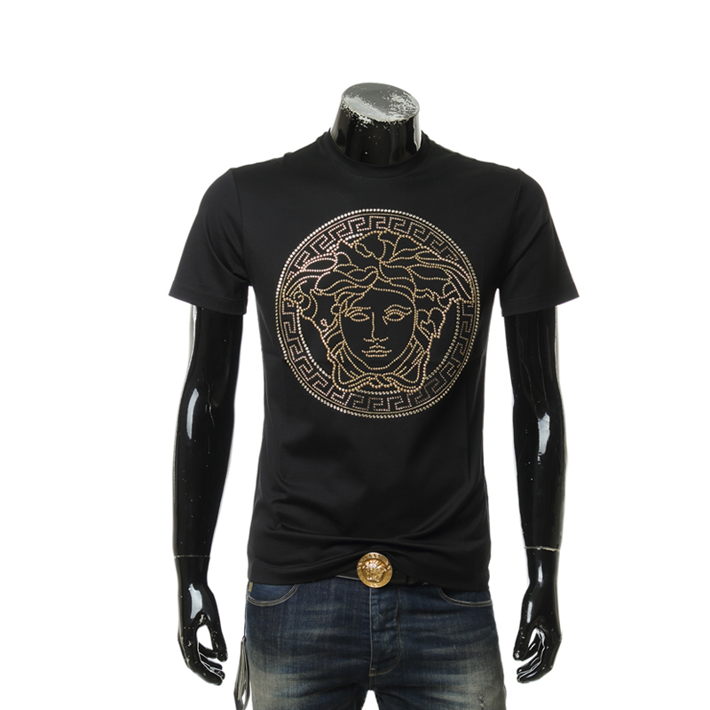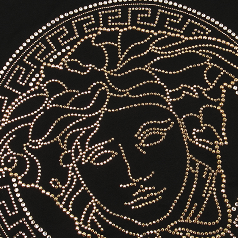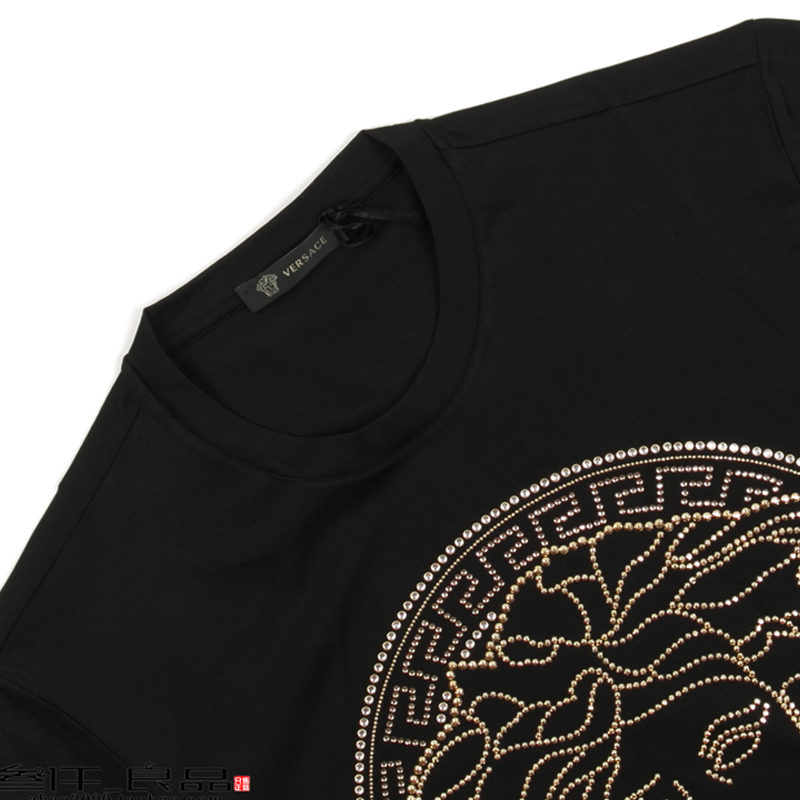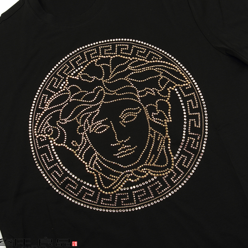 Versace带来的这款短袖T恤整体都呈现出一种简约而不失设计感的模样,整体的黑色调衣身在胸前加入烫钻处理的美杜莎图案,恰到好处的提升大牌的魅力,同时也带有叛逆不羁的街头感,让你休闲青春出街凹造型,达到引人注目的效果。