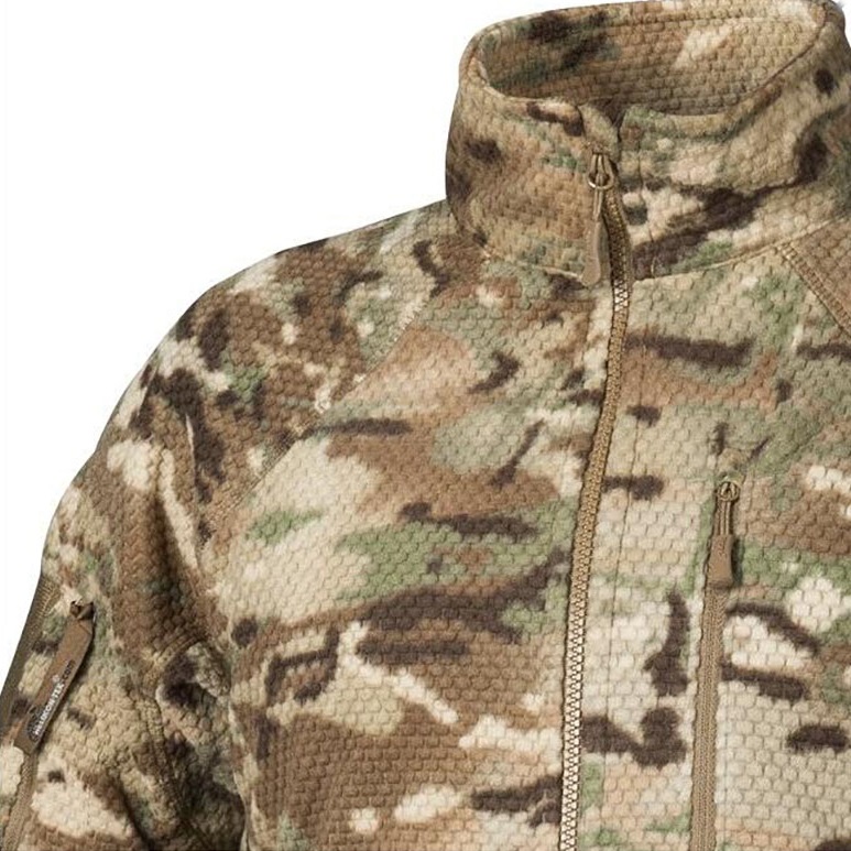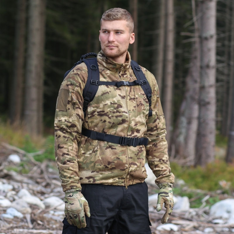 夹克采用立领开衫版型,结合摇粒绒内衬处理,有效修饰颈部线条,同时阻挡冷风入侵更保暖。创意的迷彩印花装饰,增添了视觉上的层次感,同时增强户外运动的安全性。贴心的可调节下摆设计,提供舒适的穿着体验。