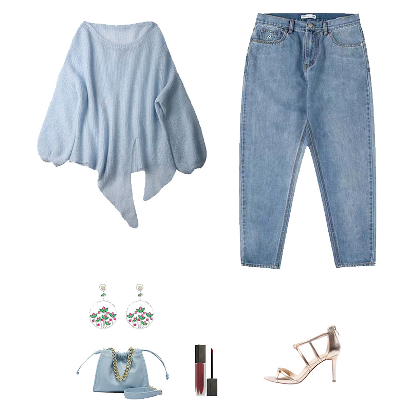 宽松立体的九分牛仔裤,用萝卜裤可爱造型为女性创造富于青春活力的衣品。用水蓝色针织羊毛衫搭配,加上粉色系扣高跟鞋,拉长身材比例,让女性更加自信。