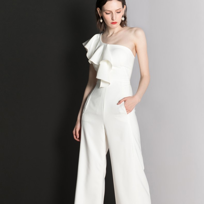 整件衣服采用立体剪裁设计版型挺括有型,纯白色的外贸面料极为难得垂坠感极强,是不容易皱的面料。颜色选择上用了微亮面的白色视觉上看上去高雅感十足。肩部采用荷叶边设计漏出修长脖颈营造天鹅颈,不对称的斜肩设计体现设计感。自然收腰的宽松修身彰显女人味。超高腰线和拖地的长度在视觉上给人错觉营造长腿效果。整体风格偏法式宫廷典雅风。给人一种情形淡雅的感觉,无论是上班还是宴会都可以完美驾驭。
