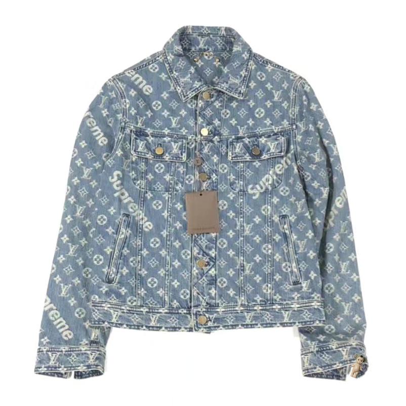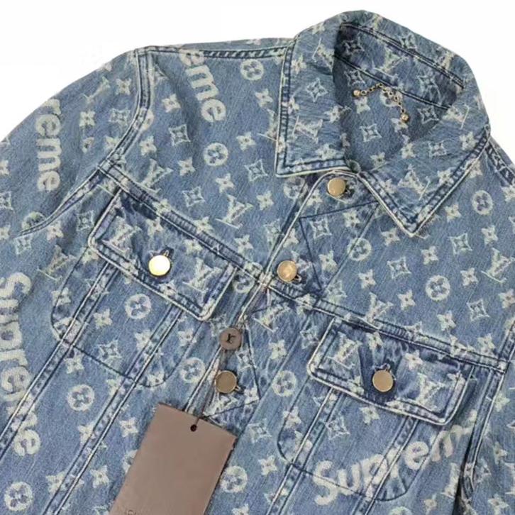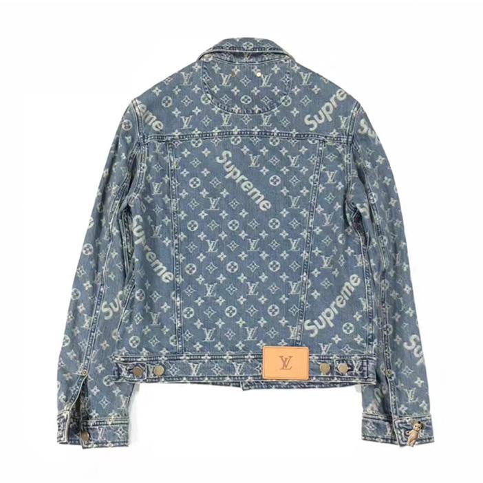 与SUPREME联名款外套,满印以老式印花与标志;呈现出饱满的视觉感,提升吸睛力与时髦度;搭配做旧感牛仔衣身,休闲中透露出一丝时代气息;点缀以金属纽扣,加添酷潮感。