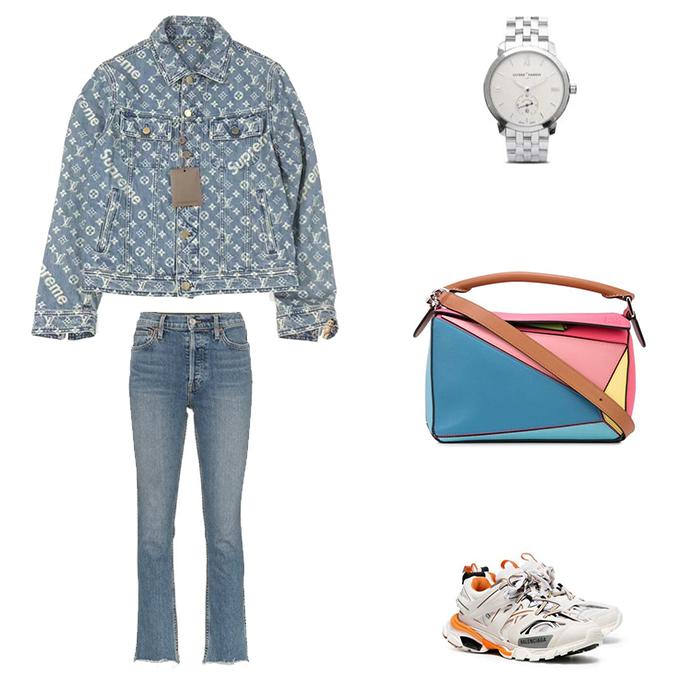 休闲蓝色牛仔外套,可搭配同色系阔腿裤;脚踩撞色运动鞋,佩戴上银色圆盘手表;再背上拼接设计的手提包,内里穿着白色短袖T恤,打造个性街潮女穿搭。