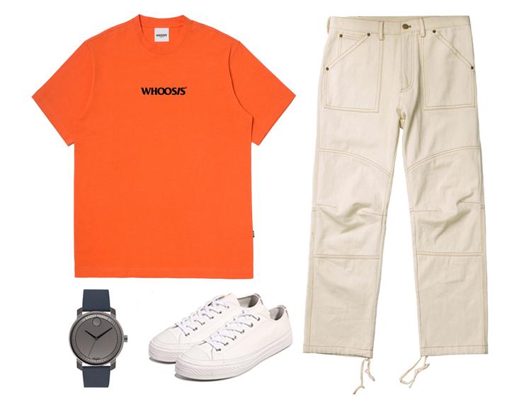 简约休闲的一款圆领T恤,利用宽松的廓形剪裁,搭载桔色调的渲染,视觉上十分醒目抢眼。日常穿着中,建议可围绕年轻、休闲方面来展开搭配,例如下装穿着一条米白色的休闲裤,搭配一双低帮帆布鞋,轻松随性,尽显新青年印象。