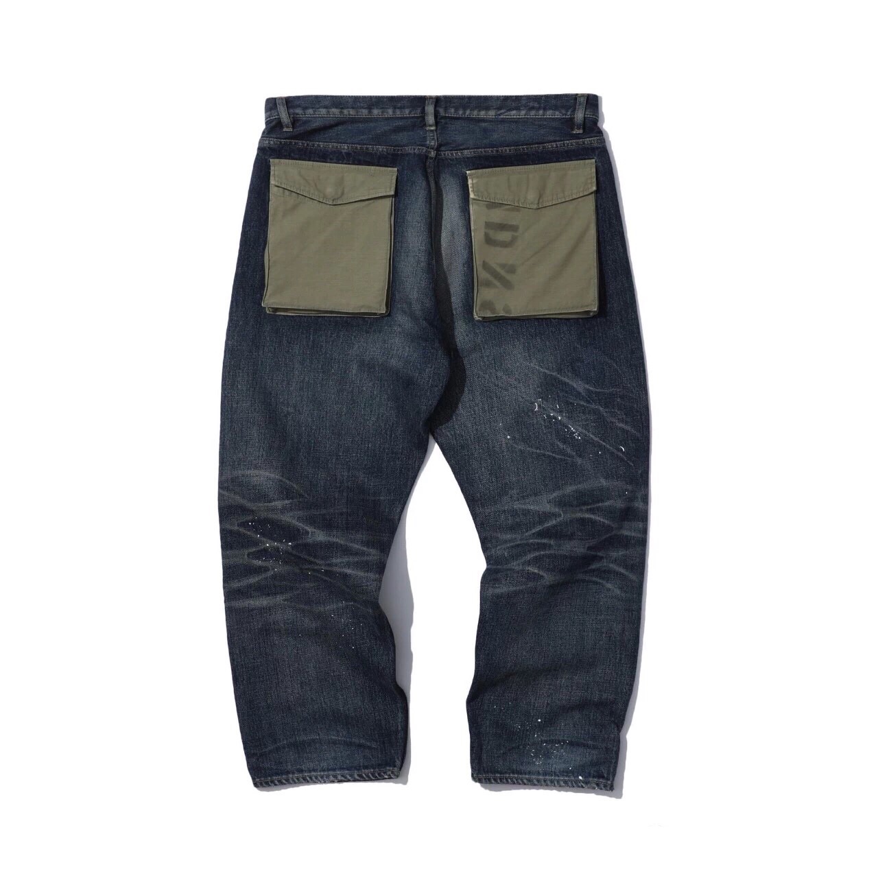 以仿古功艺结合严选的布料带来的泼墨口袋牛仔裤。此番在洗水处理和仿加工上进行了特殊的处理,并选用最高级别的军布,只为追求最高的品质。参照40年代对的T BACK 背部效果,还原度高,最高品质的工艺制作。
