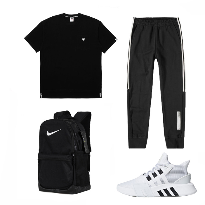 看似平平无奇的黑色t恤衫,下身搭配同色系的运动裤,撞色的白色条纹营造出极为强烈的视觉冲击感。更带来一丝运动气息。白色高帮鞋的加持,延伸腿部线条洒脱而帅气。