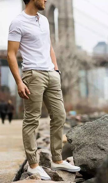 亨利领的T恤一直是经典和有型的代表,随意搭配都别有一番味道。下身选择一条浅色的束口休闲裤,修身的同时,又带来时尚都市的潮人气息,外加一双别致的白色帆布鞋,露出脚踝,让整体造型更具层次感。
