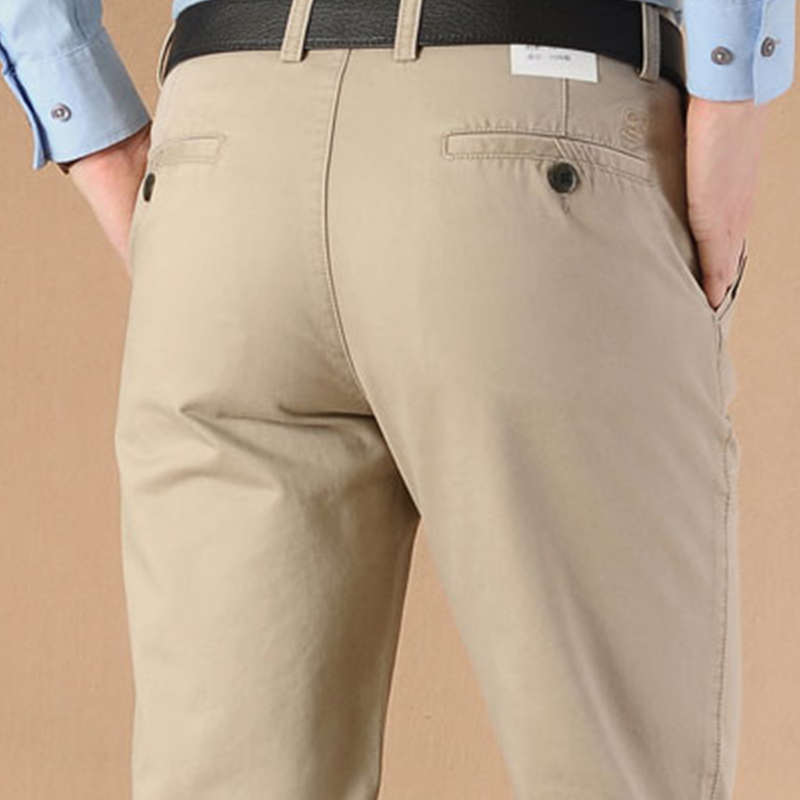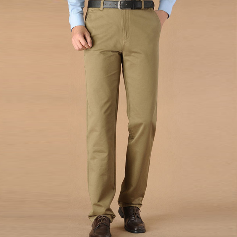 采用卡布其面料制作, 卡其布是一种主要由棉、毛、化学纤维混纺而成的织品。卡其布通常是浅色的不同风格的布料,布料以棉花为主。质地更紧密,手感厚实,纹路明显,挺括耐穿,但不耐磨。将其用作长裤在便装中也变得流行起来。