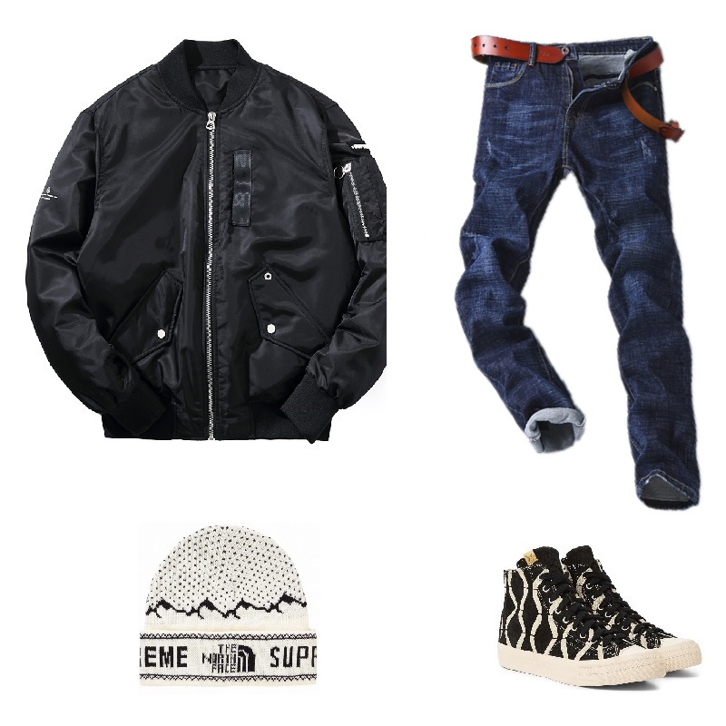 修身的裤型使得上身效果很有休闲感,可以轻松搭配出港风造型。上衣选择一款立领棒球夹克来搭配,既青春又百搭。鞋子搭配一双经典帆布鞋,复古减龄,冬季造型可以加入一顶撞色线帽,突出整体的造型感,温暖而不失街头气息。
