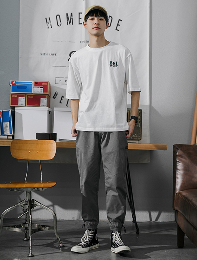 白色短袖是夏季较为常见的单品,下身搭配灰色宽松束脚裤,纯色款式最容易带给人一种干净整洁之感。脚下的鞋子采用黑色高帮帆布鞋,提升了整体造型的年轻活力,能让人眼前一亮,让你在简单中透露出一丝清新自然的时尚气息。