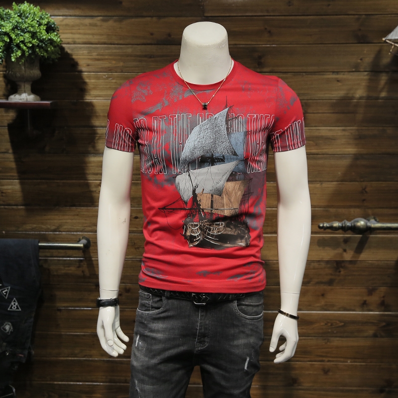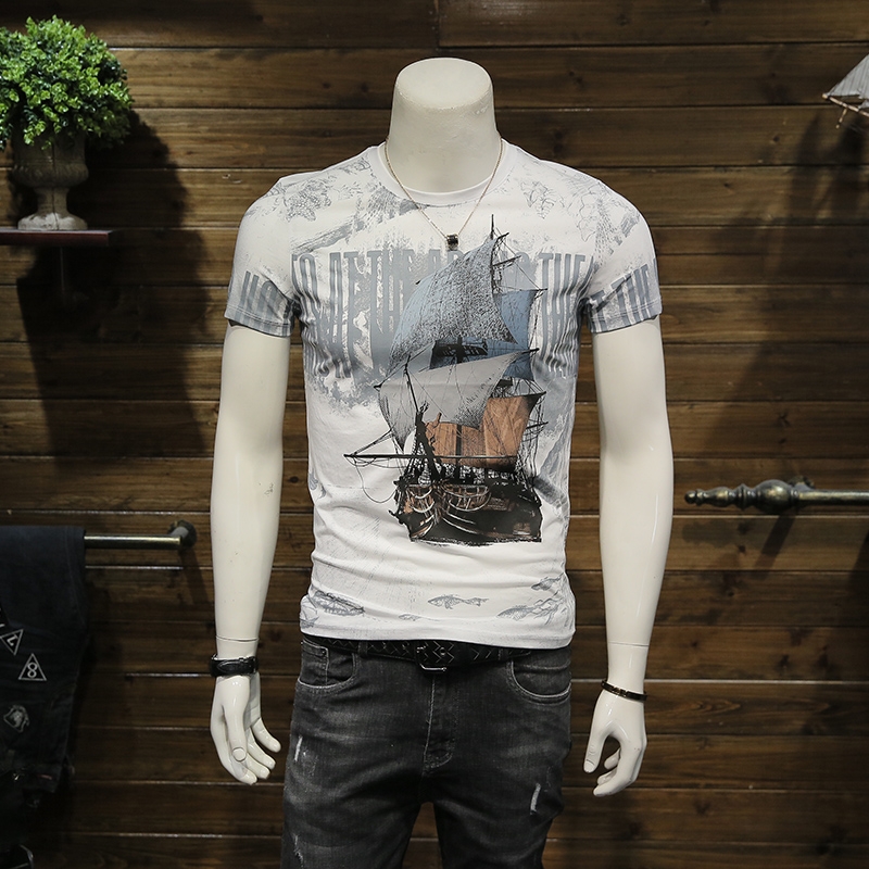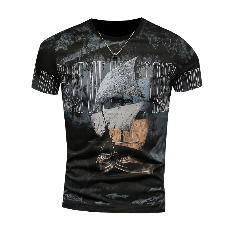 这款短袖T恤衫采用了修身版型剪裁设计,凸显男士挺拨有力的身材曲线彰显都市型男的魅力与时尚感;休闲简约圆领款式,带有随性自由的洒脱气息;衣身的前码进行海盗船图案装饰,数码印花的工艺使得画面感更加强烈,吸睛亮眼彰显个性潮流。