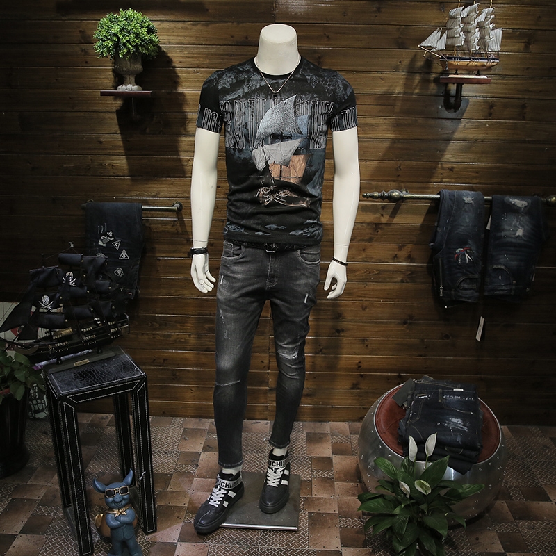 这是一款带有个性潮流感的短袖T恤衫,有着时尚显身材的修身版型,再配以舒适亲肤的面料,凸出服装品质感;T恤衫向来与牛仔裤是最佳拍档,选择一条复古灰黑色的修身小脚九分款式,并带有破洞设计,既能展现出笔挺身姿又增添了潮流感,穿着更显年轻帅气;脚踏一双黑色个性休闲鞋,炫酷有范儿。