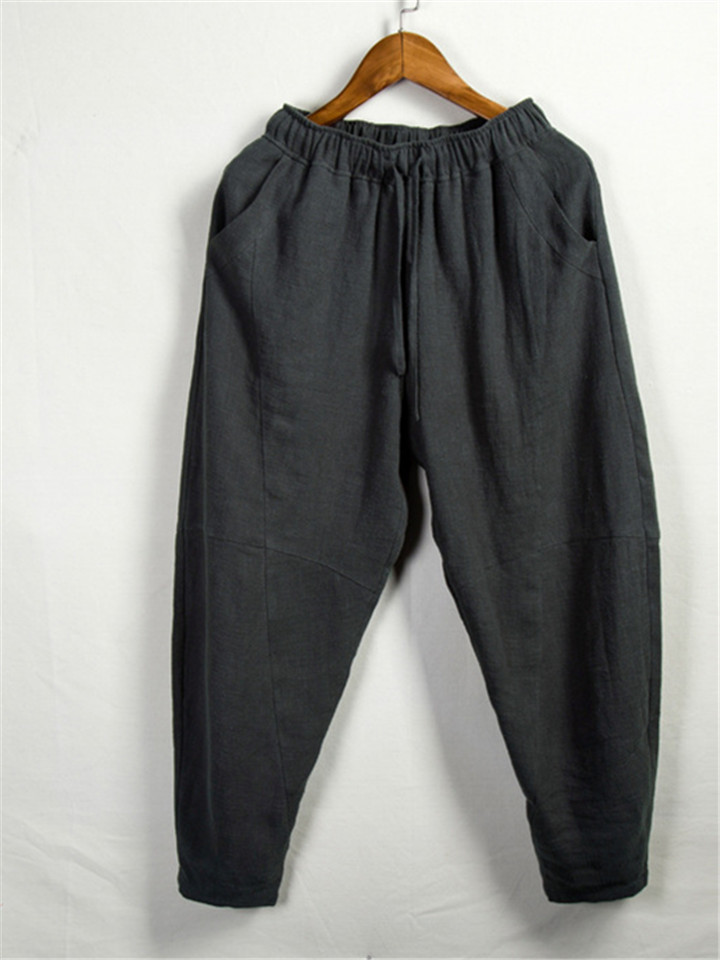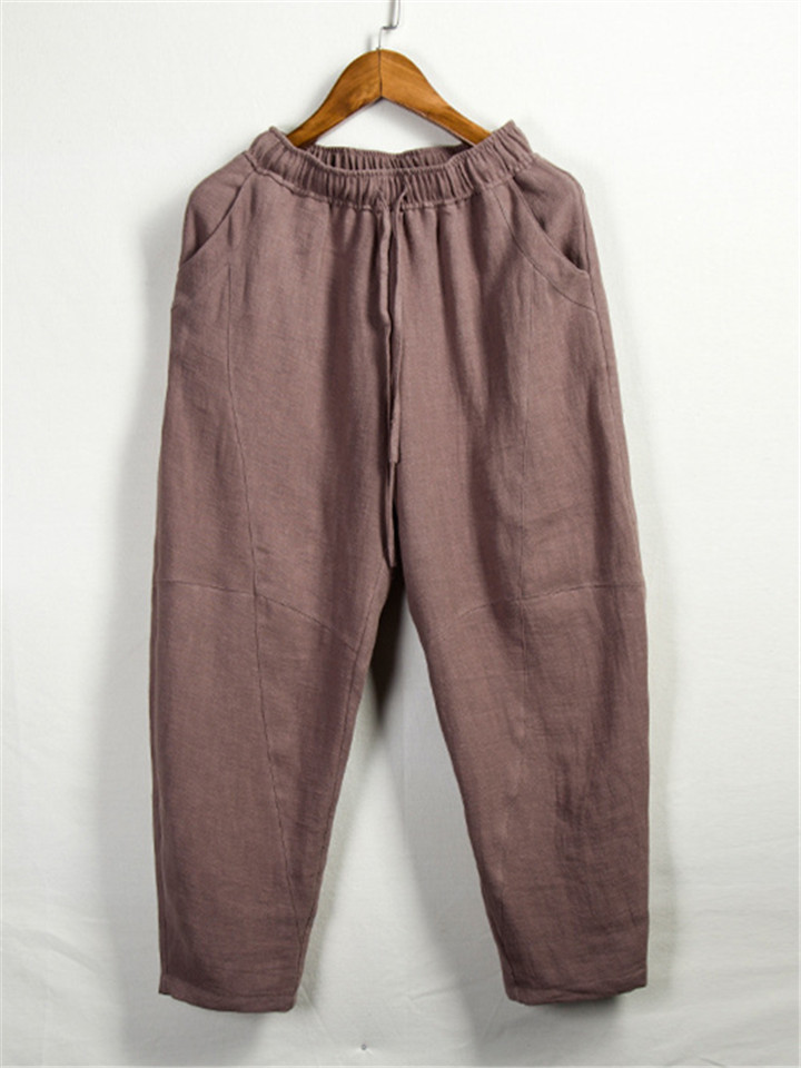 宽松舒适的休闲裤,上宽下窄的版型,对身材有很好的修饰作用。裤腿上的拼接设计,给整体注入了一丝时尚感,是整个裤身的重点。松紧抽绳的腰身,穿着舒适,不会有舒服的感觉。舒适的亚麻面料,穿着凉爽透气效果好,即便是炎热的夏季穿着,也十分合适。