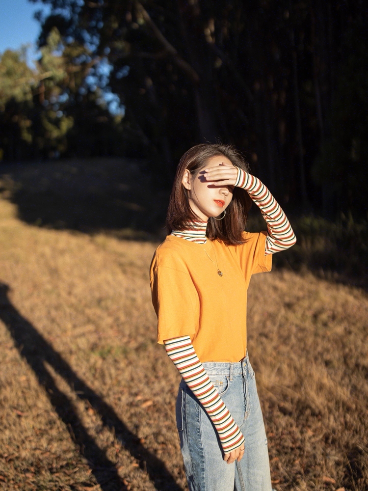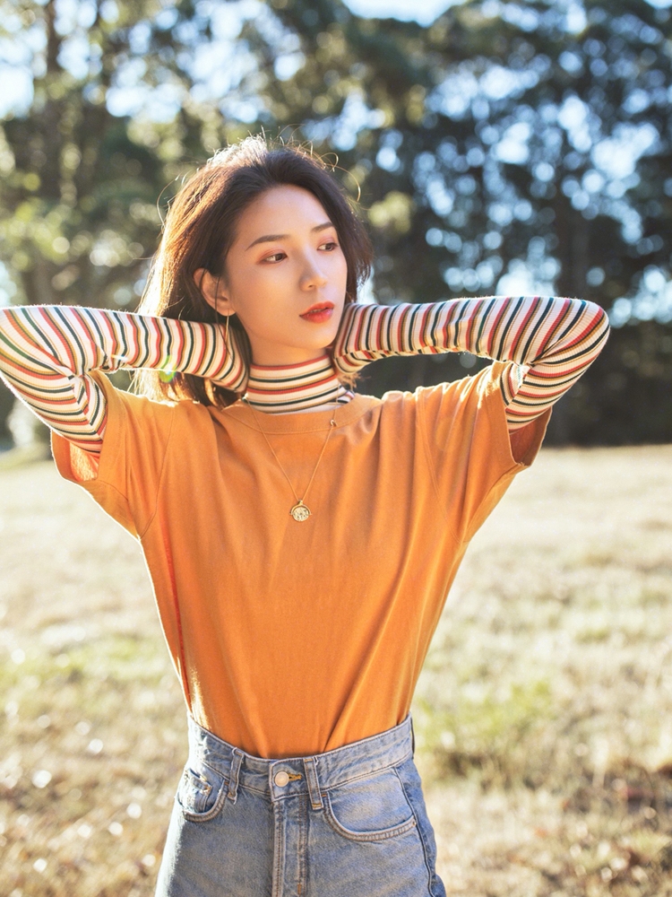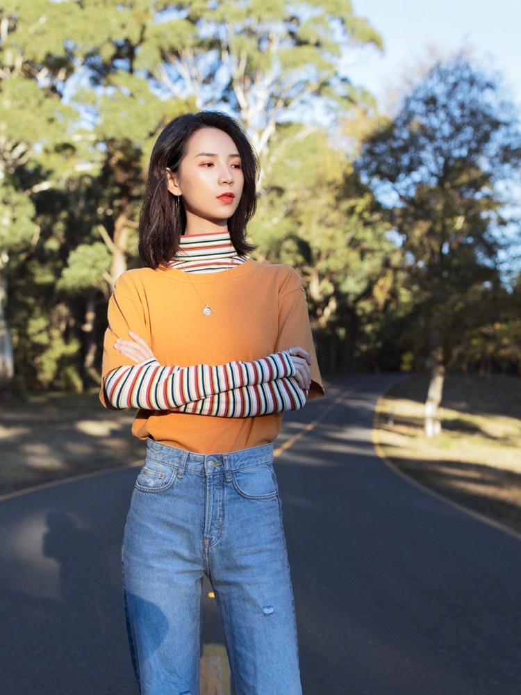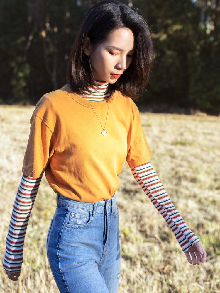 条纹打底+T恤+高腰牛仔裤,个性简洁,时髦感强。
