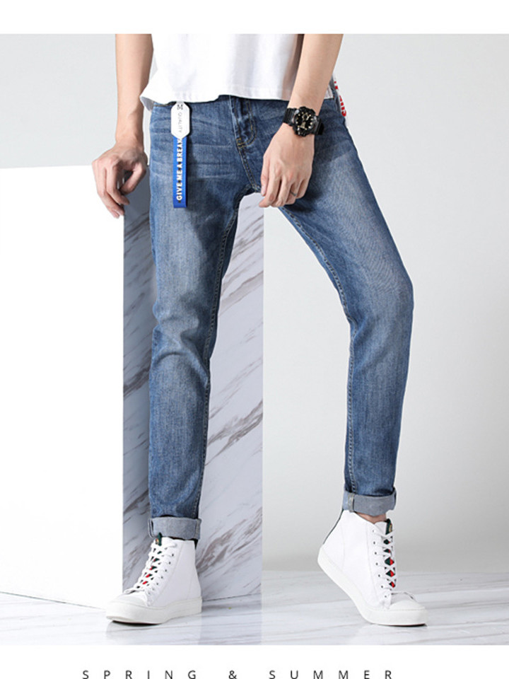 浅浅的牛仔蓝色, 很适合春夏。修身小脚的版型,贴身显瘦。有微小弹力。上身很舒适、搭配T恤。清新气质。