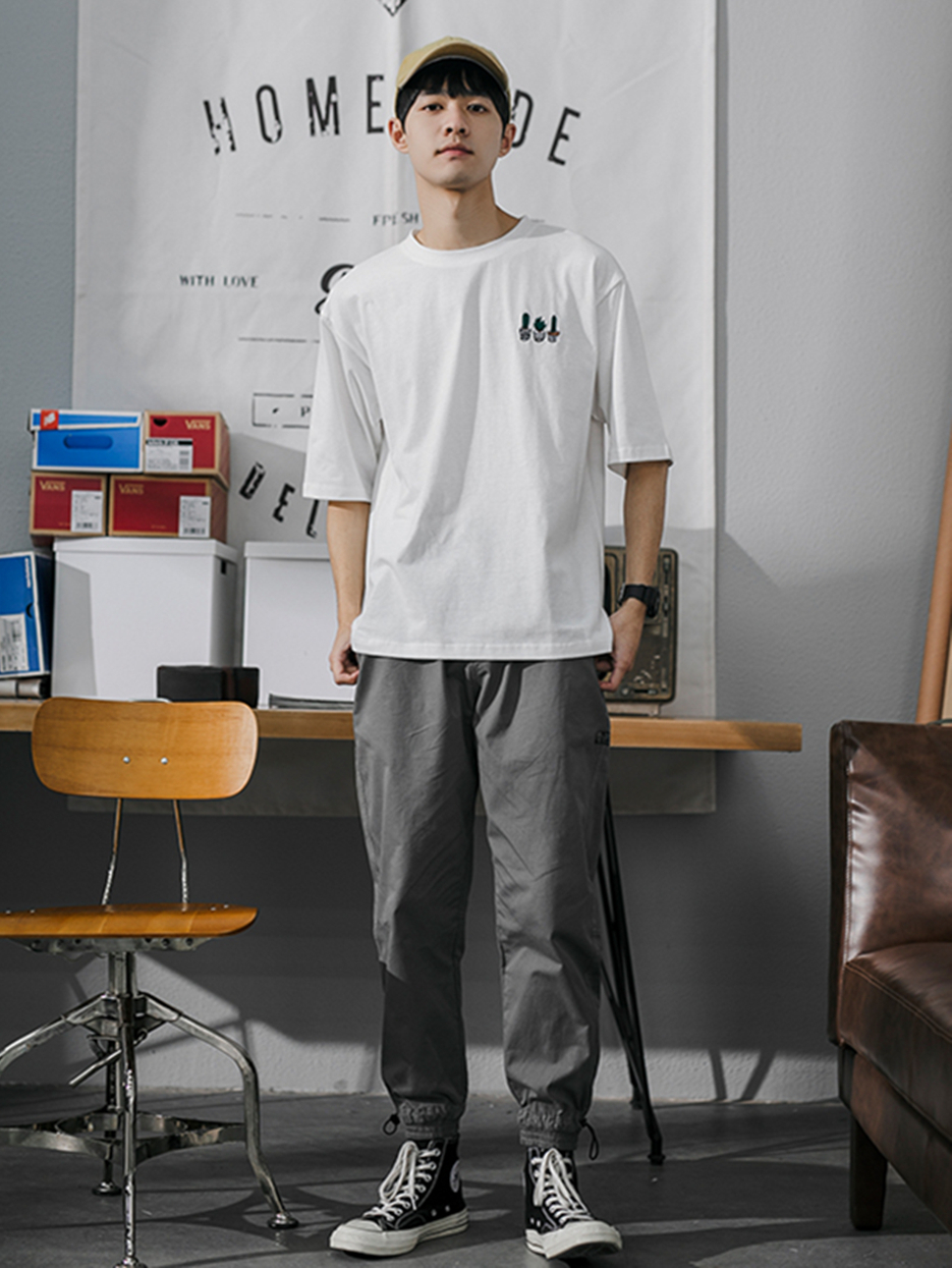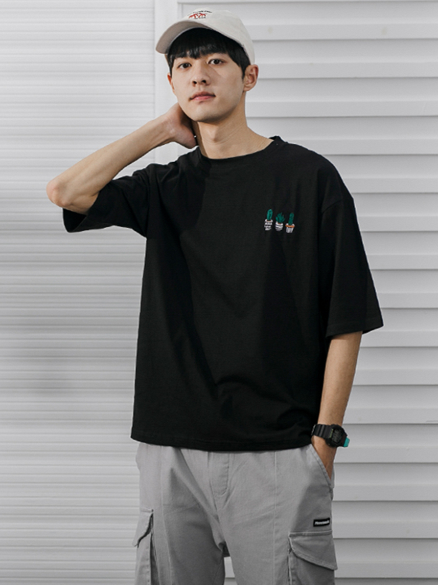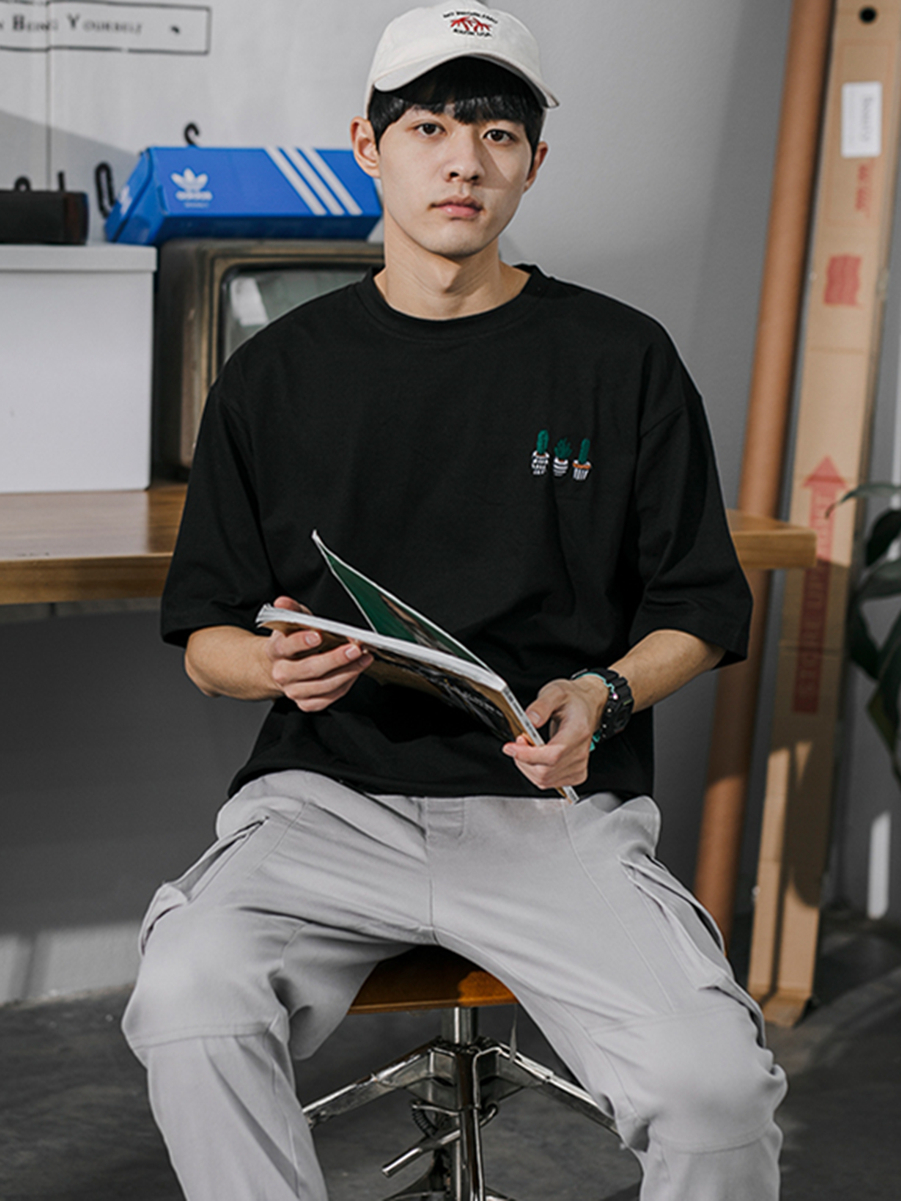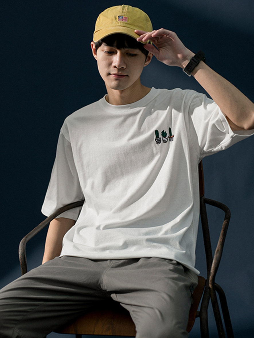 这件T恤最大的亮点是胸前的刺绣,形成的仙人掌图案是当下最为流行的ins风格,让人紧跟住了时尚的发展,一眼就可以注意到。衣身的版型比较宽松,穿着让人可以自由自在的活动,瞬间变得年轻了起来。