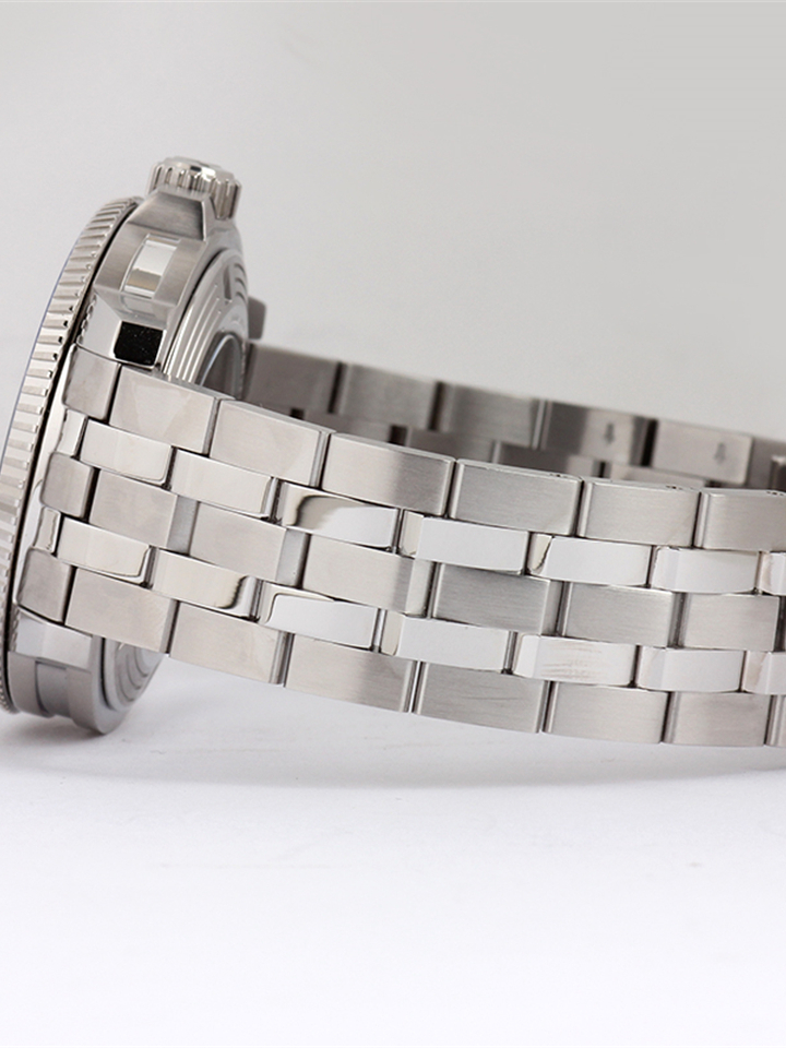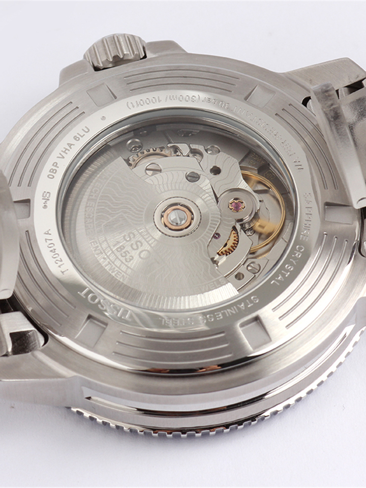 蓝宝石玻璃镜具有良好的耐热、耐磨和防水效果。皇冠的圆形设计有复古的味道。手表底部的设计不透明,凸显了机芯的优雅和神秘。流线型精细钢表带非常适合手腕,佩戴舒适。