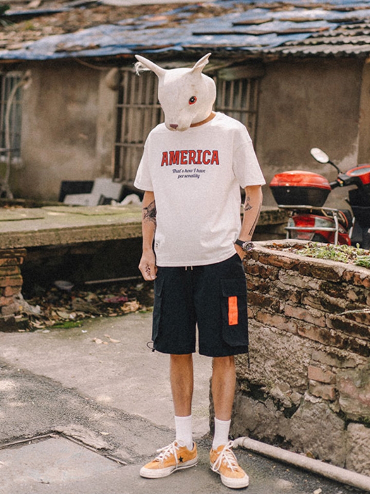 带着简约印花的T恤,既落落大方,又展现出其独特感,让人觉得与众不同。在穿搭的时候,可以采用同风格的休闲裤作为穿搭,纯色的工装短裤能够带来低调和谐又不失时尚气息的视觉效果。