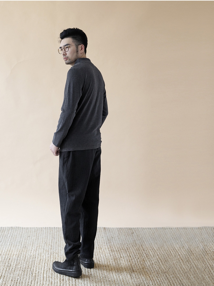 深灰色的抽绳休闲裤,深沉的中性色系显得洒脱而又怀旧,可以轻松打造文艺风的型男出街穿搭。上身搭配深棕色的高领针织衫,成熟气质和知性魅力兼具,最后搭配黑色的方头短靴就好。