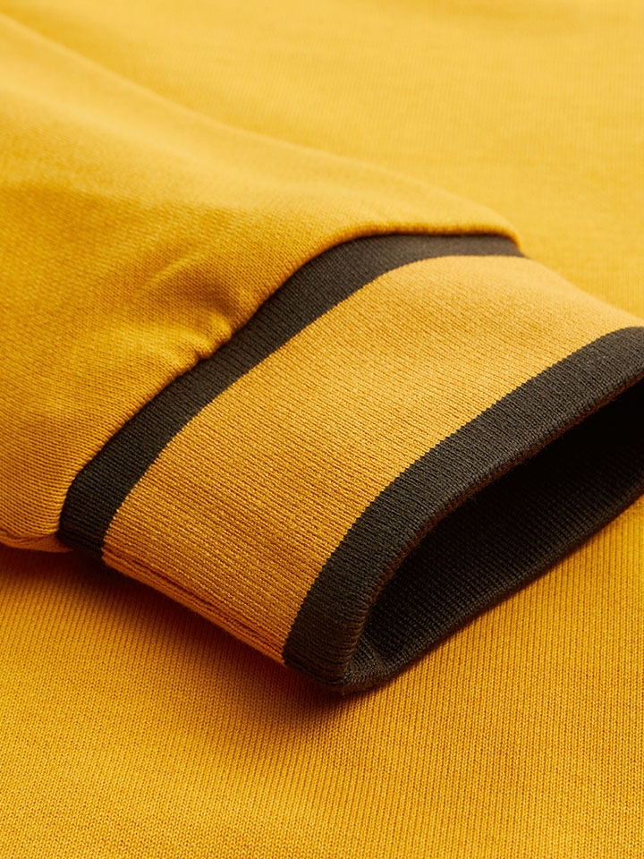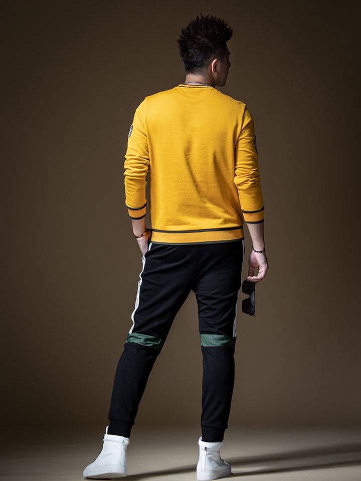 经典的姜黄色调在萧瑟的秋季中显得格外温暖与明媚,在人群中一眼吸睛。休闲感的卫衣随意搭配上一条简约的束脚裤就足以风格感十足,深色系的裤装不仅与卫衣上的黑色包边进行呼应,还能很好的凸显黄色调的个性与张扬。