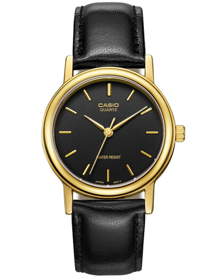 这款来自卡西欧的手表采用了不锈钢金色表壳与皮质表带的款式,搭配金色表盘和指针与刻度,具有100米的防水能力,方便佩戴更省心。